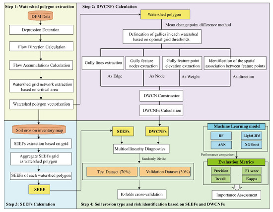 According to existing research [31,60,61,62,63], this paper selected four models (i.e., artificial neural network, light gradient boosting machine, and the random forest and extreme gradient boosting algorithms), which are suitable for quantitative simulation of soil erosion risk. DWCNFs, SEEFs, and the combination of two factors were input into four machine learning methods to identify erosion types and risks, and their identification performance was compared through various evaluation metrics. Given the robustness of machine learning methods, four-fold cross-validation was conducted in the training process.
