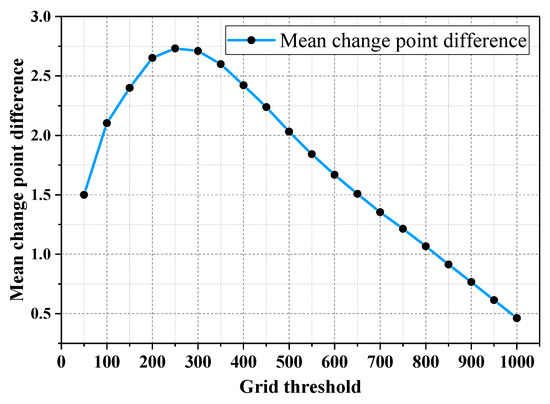 In Equation (2), and represent the mean value of sequences and . The difference between S and is the mean change point difference. When the difference is the largest, the corresponding grid threshold is optimal, because it can retain the topographic features of the watershed to the greatest extent. As shown in Figure 3, when the grid threshold was 250, the difference was the largest, thus, 250 was selected as the optimal grid threshold to extract the gully lines.