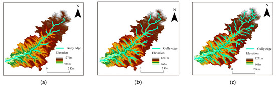 To show the effect of gully line extraction with different thresholds, the undersized and oversized thresholds were visualized in Figure 4. When the number of grids was 50 (Figure 4c), the gully lines were excessively dense, and when the number was 1000 (Figure 4a), the gully lines were excessively sparse. When the number was 250, the extraction effect of the gully lines in the watershed was appropriate (Figure 4b).
