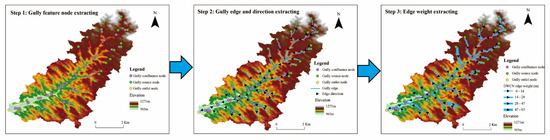 After the operations of depression filling, flow direction calculation, and flow calculation on DEM data, the watershed was extracted according to the equal area. Then, the gully terrain feature points and gully lines of each watershed were extracted. The extraction process is as follows: (1) The mean change point method was used to calculate the optimal grid threshold of each watershed, and then the value was used to extract the gully lines. (2) The Strahler method [58] was used to classify the gully lines. (3) The topological relationship between the intersection points on the gully lines was determined, and the gully feature node was extracted (i.e., the gully confluence node, the gully source node, and the gully outlet node).