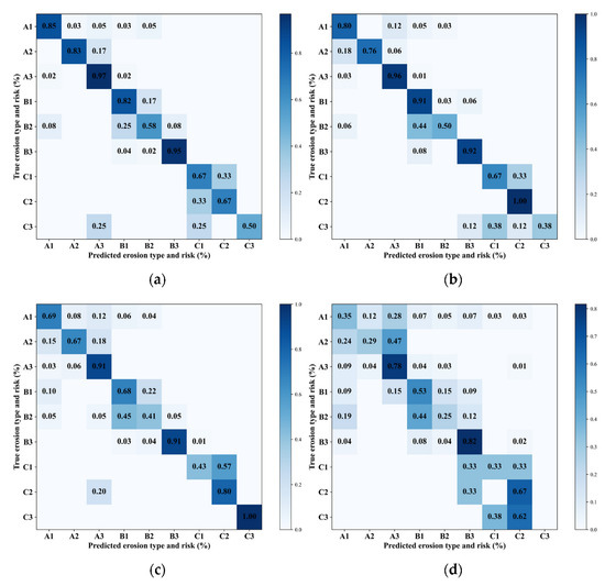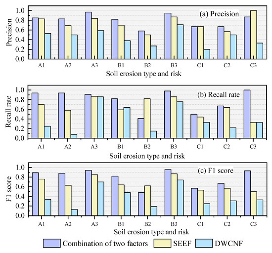 In addition, the machine learning-based model used in this paper also contributes to a more stable identification result. For example, in the comparison of the identification of typical samples, the identification accuracy of the method using the combination of two factors and the optimal machine learning-based model is up to 80.11%. The same superior identification performance is also observed in the results of atypical samples, where the accuracy is also maintained at 70% and above, indicating that the identification of soil erosion type and risk using machine learning with the combination of DWCNFs and SEEFs is effective. Simultaneously, in the comparison of the identification results of the combination of two factors and SEEFs, the machine learning-based model is also capable of bridging the information gap between the erosion factors in some cases, thus, the performance of the SEEFs compared to the combination of two factors may not be significantly degraded, as shown in Figure 7a for types A1 and C1.