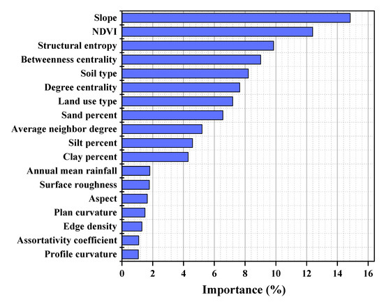 In Section 3.4, structural entropy, degree centrality and betweenness centrality were at the relative forefront of the importance ranking (Figure 9). It suggested that the DWCNFs, which quantitatively describe the spatial structure of the watershed, have agreeable performance for the identification of soil erosion types and risks.
