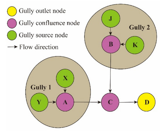 For the network centrality, degree centrality and betweenness centrality were employed to describe. However, the importance of betweenness centrality (9.012) is greater than the degree centrality (7.65). For the different importance presented by different DWCNFs, a possible explanation for this is that for nodes with the same degree, the degree centrality is unable to distinguish these nodes, while betweenness centrality can handle this according to the shortest path. As Figure 10 shows, node A is connected with nodes X, Y, and C, and the degree is 3. Node C is connected with nodes A, B, and D, and its degree is the same as node A. Measured by degree centrality, the importance of A is consistent with that of C. However, the actual situation is that if the runoff flows from the gully source node (X, Y, J, and K) to the gully outlet node (D), it must through node C, thus, the load (i.e., flow accumulation) carried by C is higher than that of A. In this case, betweenness centrality can distinguish this confusing condition while degree centrality cannot, thus, it is more important than degree centrality.