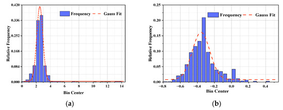 For the edge density and assortativity coefficient with extremely low importance, Gaussian fitting was employed to fit their frequency distribution. In Figure 11a, the fitting coefficient () of edge density can reach 0.9896, indicating that Gaussian fitting can explain 98.96% of the frequency distribution. Simultaneously, 91.12% of the edge density is extremely concentrated between [1.75, 3.75], indicating that the change in edge density is unapparent, thus, its response to soil erosion is not sensitive. These situations are understandable because this paper ensures that the area of each watershed was consistent when it was extracted, and the edge of the DWCN, i.e., the gully lines, has determined the optimal threshold through the mean change point method. Through the above two steps, the numerical variation of edge density will be comparatively stable.