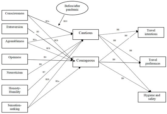 When it comes to other personality traits and their influence on travel behavior and intention to visit risky locations, there are only a few studies in the tourism field. The study by Kovačić et al. [12] explored the role of six personality traits (Extraversion, Conscientiousness, Openness, Agreeableness, Neuroticism and Honesty–Humility) in travel behavior based on the perceived risk of natural hazards in Greece and found that Extraversion and Agreeableness positively influenced Conscious behavior. This indicates that people who are more extraverts and agreeable will still travel to a risky destination but in the case that they perceive as a moderate risk. Some other studies in tourism [8,60] also showed that extroverted and confident tourists will engage more frequently in risky activities. A few studies also explored the role of personality in tourists’ intention to travel during the COVID-19 pandemic [28,31]. Tepavčević et al. [28] also concluded that travel intention during COVID-19 was positively influenced by Extroversion. Moreover, Talwar et al. [31] explored the influence of the Big Five personality traits on travel intentions during COVID-19 pandemics, and revealed that Extraversion had the strongest influence on intentions to travel during the pandemic. Based on this, we can suggest the following hypotheses: