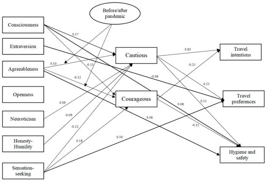The current research contributes to the existing theory in several ways. First, it contributes to the understanding of the relationship between tourist personality, tourists’ reactions to travel risk perception and changes in their travel behavior during the time of the COVID-19 pandemic. The fact that this was the biggest pandemic in recent decades, because of huge media coverage and the fact that even doctors and governments were not sure what is the right way to deal with it, caused even more insecurity in people. Moreover, the measures were very harsh in many of the countries where the research was conducted (border closure), and this also caused more fear, concern and distrust of travel in people. The global risk of coronavirus created an atmosphere of high threat for travelers’ health, so exploring the mentioned constructs in this context has important implications for theory. The findings provided empirical evidence that tourist personality affects changes in travel behavior influenced by a coronavirus, both through their reactions to travel risks (cautious and courageous behavior) but also directly (specifically agreeableness, consciousness, extraversion, sensation seeking). Another important finding is that extraversion and openness to experiences, in specific high-risk situations such as the current pandemic in the time when no vaccines were available to people, did not influence reactions to travel risks, contrary to previous studies that proved their influence in cases of lower and moderate travel risks. In the current study, however, extraversion showed a direct influence on travel preferences, indicating that extraverts might not be ready to change their travel style if this means a more individualistic travel style and distancing from other people. Furthermore, this is the first study to confirm the linkage between reactions to travel risks (cautious and courageous) and changes in travel behavior influenced by COVID-19.