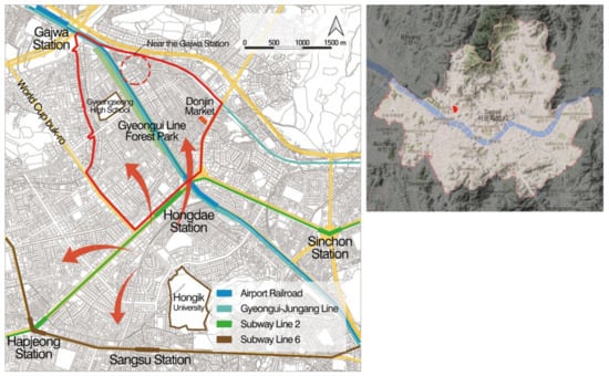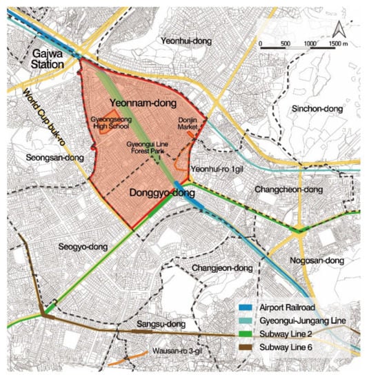 Our study area includes Yeonnam-dong and some parts of Donggyo-dong. For covering the commercial areas in Yeonnam-dong, the study area was set as the area enclosed by the roads extending from the area between the northern Gyeongui–Jungang Line to the vicinity of the Gajwa Station to the north, World Cup buk-ro to the west, and Yanghwa-ro to the south. Administratively, the study area covers Yeonnam-dong and a part of Donggyo-dong (Figure 1 and Figure 2).