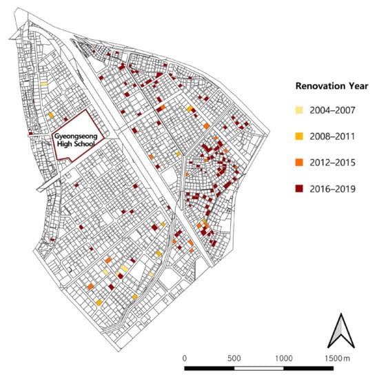 The 149 buildings surveyed were divided into two architectural types: pre-1985, single-family houses constructed between the early 1970s and the mid-1980s, and post-1985, multifamily houses constructed between the mid-1980s and the late 1990s. A large portion of the multifamily buildings were found in the block having irregular alleyways between Dongjin Market and the subway station. This is the most commercialized area, with a large number of renovated multifamily housing buildings. The temporal distribution for the construction and renovation [year (n)] of this type of buildings is as follows: construction: 1966 (4), 1967 (4), 1968 (3), 1969 (6), 1970 (12), 1971 (4), 1972 (8), 1973 (9), 1974 (12), 1975 (3), 1974 (12), 1975 (3), 1976 (1), 1977 (2), 1978 (2), 1982 (1), 1983 (1), 1984 (2), 1985 (1), 1986 (2), 1987 (2), 1988 (2), 1989 (12), 1990 (14), 1991 (11), 1992 (10), 1993 (4), 1994 (3), 1996 (4), 1997 (1), 2001 (4), 2003 (1), 2005 (1), 2011 (1), unknown (2); renovation: 2004 (1), 2005 (3), 2007 (1), 2009 (1), 2011 (5), 2012 (3), 2013 (5), 2014 (11), 2015 (21), 2016 (28), 2017 (41), 2018 (25), 2019 (1), unknown (3).