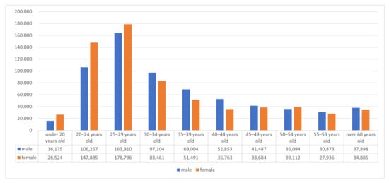 The nature of the trade zone in this area is reflected in the types of stores that have opened here. As of November 2020, according to the trade area analysis conducted by a company using credit card transactions, the proportions of food service and retail sectors account for 64% and 18.5%, respectively (Table 1), among the total number of shops. According to the frequency of KB card use by the floating population, the area is visited most frequently by women in their 20s (24.8%), followed by men in their 30s (12.6%) and 40s (7.2%), which indicates that the Yeonnam-dong area is popular among young people (and more among women than men) (Figure 4).
