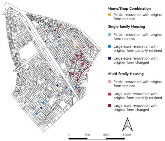 We aimed to identify the characteristics of the changes in the buildings and alleyways in Yeonnam-dong, Seoul, where low-rise, residential buildings are being renovated or repurposed into commercial buildings, as well as to investigate their renovations, repurposes, and sociocultural implications. Thus, we surveyed and classified 149 renovated buildings, investigated the perceptions and ambiance of the area and buildings using a trade area analysis and interviews with visitors and store owners, and uncovered the importance of renovation. Since the early gentrification, a trend of performing renovations that retained the original form of the building from the initial renovation stage was seen; this created an ambiance of nostalgia, naturalness, and authenticity, along with the urban conditions of low-rise, residential buildings in Yeonnam-dong, a representative undeveloped area. These renovated buildings reflect the social status, taste, and practice of gentrifiers, and they reveal a hybridization of the past and present, Korean circumstances and exotic cultures, and residential and commercial buildings. As commercialization progressed, renovated buildings vastly differing from the original and displaying active commercial characteristics were seen. Our findings imply that the area’s early ambiance, which had an air of “distinctiveness”, has lost its personality and begun to generalize. Thus, numerous gentrifiers have been replaced and several aspects of renovation have changed that the visitors are aware of.