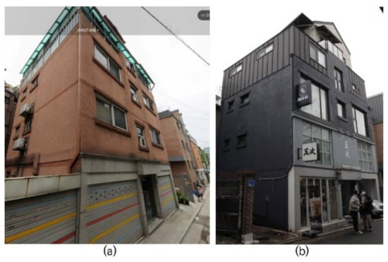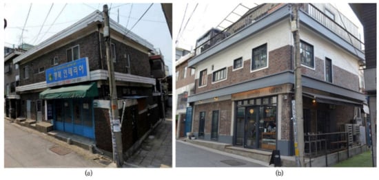 (a) Pre- and (b) post-renovation pictures of building at 223-20 Yeonnam-dong.