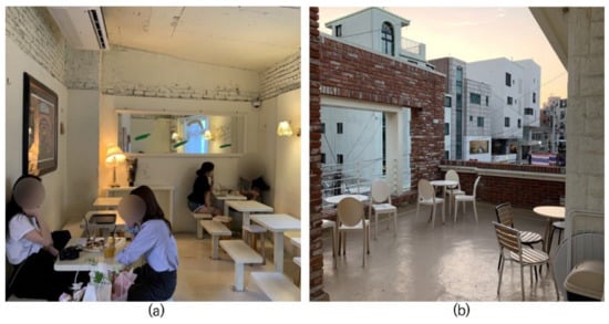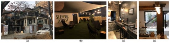 The building at 223-20 was constructed in 1972, and the entire building was renovated in 2018 into a bakery–café. The parking space was converted into the interior of the café accessible from the street, the gate was demolished, and the space was converted into a vestibule leading to the main hall of the café on the first floor. A fake wall was installed on the façade, thereby forming a special outdoor space on the second-floor terrace. The square fake wall of decorative bricks brought a new form to the building, while maintaining the original building façade, whose color was changed to a brighter tone. The interior paid little attention to decorative elements, but the rough brick finish (exposed by removing the ceiling) and the bright color finish attributed a unique charm to the place. The commercial charm of the café was staged by the diversity of interior and exterior spatial features. Compared with the small stores of the area, the café occupies ample indoor and outdoor spaces of the entire building (Figure 10 and Figure 11).
