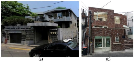 (a) Pre- and (b) post-renovation pictures of the building at 387-24 Yeonnam-dong.