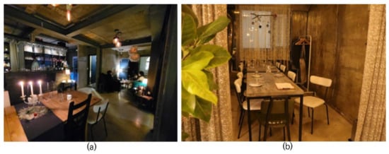 The building at 387-24 Yeonnam-dong was constructed in 1992 and renovated in 2018, keeping the original shape intact. A multifamily house, it included a staircase to reach each floor, which was retained during renovation. A vintage look was staged by removing the balustrades of the stairs and exposing the unpainted concrete. Steel and glass were used to create the stairs, terraces, railings on the roof, and the roof of the stairs, giving an open feel to the building. New openings were added for each level. The main focus of renovation was exposing the interior and exterior spaces of the building. This building houses an Italian restaurant, chicken dish restaurant, wine bar, and cocktail bar. The interior of the wine bar on the second floor shows that the walls were removed, and the load of the slab was carried out using reinforced steel columns and beams. The steel columns and beams are fully exposed, as are the concrete floor of the slab and the cement mortar of the wall. The same interior style was applied to the Italian restaurant on the third floor and rooftop. Overall, a strong personal taste of the store owners is expressed with inexpensive interior finishes and accessories (Figure 13 and Figure 14).