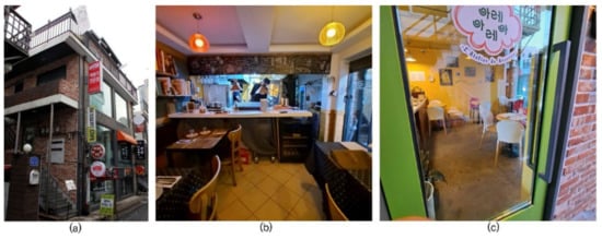 (a) Building at 147-48 Donggyo-dong and (b,c) the shops in the building.