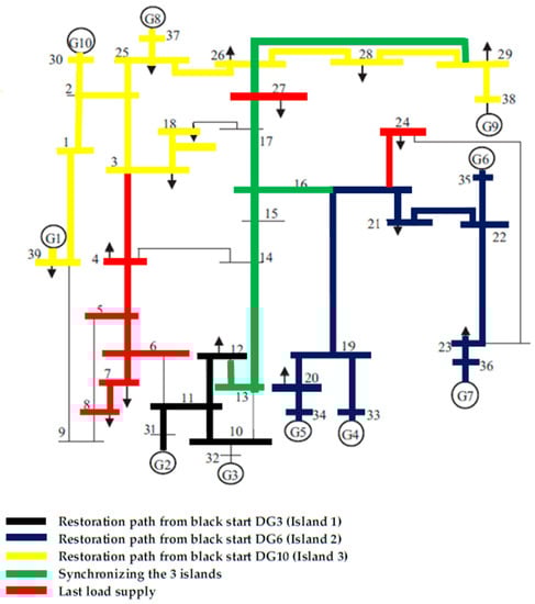 | Black Start DGs | DGs to Be Restored | Critical Loads to Be Restored | Optimal Restoration Path |