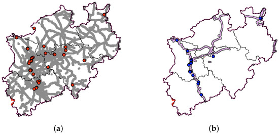 Intermodal Terminals in NRW. (a) Train Terminals and Railways; (b) Barge Terminals and Waterways.