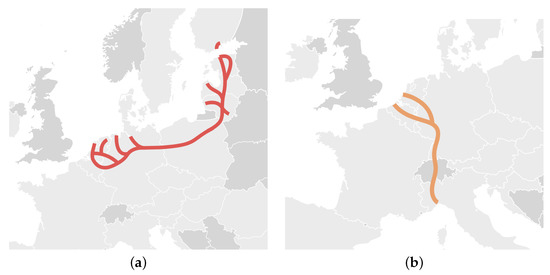 TEN-T corridors through NRW (CC BY-SA 4.0). (a) Corridor 2—North-Sea-Baltic; (b) Corridor 6—Rhine-Alpine.