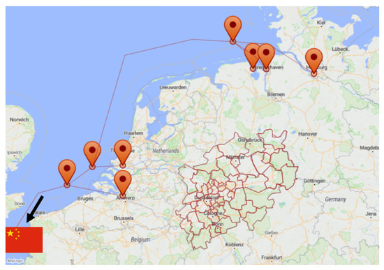 In order to answer this question, the state of North Rhine-Westphalia as a hinterland can serve as a good case to study port competition through potential hinterland scope as several ports and several modes with different carbon emission footprint compete for transport capacity within it. Modeling the competitive situation of the ports in proximity to NRW by looking at their potential hinterland scope, several conclusions can be drawn on the effects the introduction and rate setting of carbon tax will have on their competition. For this, we use a transport chain for international transport, from NRW to Shanghai (P.R. China), and depict the hinterland situation for this transport chain. This transport chain is chosen, as the Port of Shanghai represents the largest port worldwide [31], and the P.R. China is the largest trading partner of Germany regarding imports and the second largest for German exports [32], which leads to high volume shipments and represents a typical export oriented transport chain. Additionally, all ports investigated have several shipping connections to the Port of Shanghai, which allows for a comparison of the different transport chains.