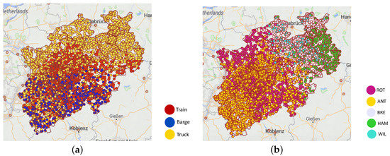 North Rhine-Westphalia (NRW) is a western state within the Federal Republic of Germany. Due to its location, it is interesting for many different modes (barge, rail and truck) and ports (Hamburg-Le Havre range) and competition between them. Roughly half of its area is located more than 300 km away to at least one port, which is usually regarded as the distance assumed beneficial for intermodal transport, yet this assumption has been challenged in the past especially for barge transport [33]. Therefore, competition in NRW is both interesting from a port as well as a mode competition’s side. This is also shown in the market shares distributed by ports and modes. Due to its close proximity to several ports of the northern range, the area of NRW is roughly split among the ports of Antwerp, Rotterdam, Wilhelmshaven, Bremerhaven and Hamburg. While the western part mostly ships via Antwerp and Rotterdam, heavily utilizing barge transport on the Rhine river, the eastern part focuses on Hamburg and Bremerhaven, using trucking and railway connections. Due to these factors, the state of NRW is interesting to investigate inter port competition through hinterland connectivity.