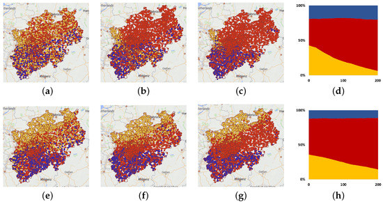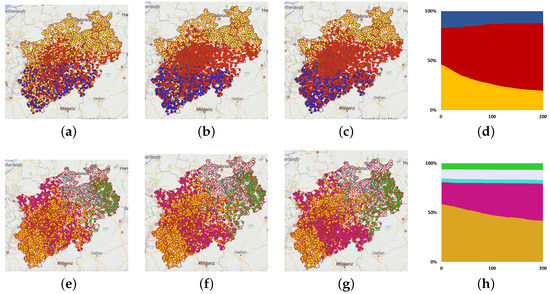 Overall potential hinterland scope per mode/port with different carbon tax levels. Mode: (a) 0 €; (b) 100 €; (c) 200 €; (d) Mode Graph; Port: (e) 0 €; (f) 100 €; (g) 200 €; (h) Port Graph.