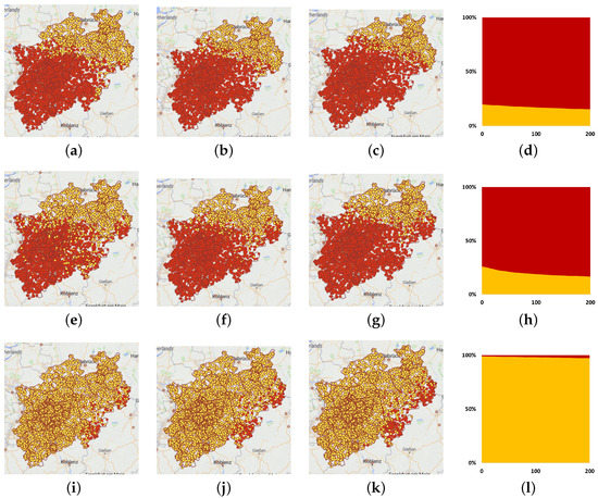 Potential hinterland scope per German ports with different carbon tax levels. HAM: (a) 0 €; (b) 100 €; (c) 200 €; (d) Mode Graph; BRE: (e) 0 €; (f) 100 €; (g) 200 €; (h) Mode Graph; WIL: (i) 0 €; (j) 100 €; (k) 200 €; (l) Mode Graph.
