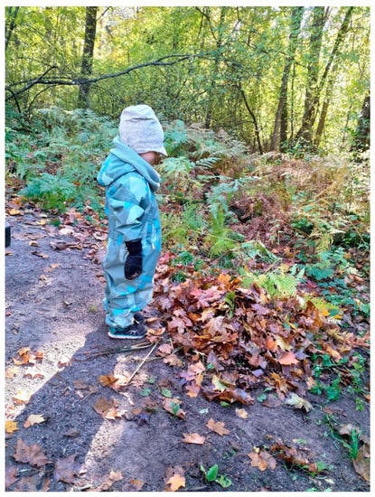 School resources such as playgrounds and green space, as well as routines and practices, affect the child’s lifestyle behaviors []. Forest School is “an inspirational process, that offers all learners regular opportunities to achieve, develop confidence and self-esteem, through hands-on learning experiences in a woodland or natural environment with trees. Forest School is a specialized learning approach that sits within, and compliments, the wider context of outdoor and woodland education” []. Forest school offers significant opportunity for children to gain access to and become familiar with nature and woodlands [] (Figure 2). Furthermore, they have the potential to significantly benefit children and young people’s physical health and mental well-being []. Forest gardens or edible schools are “edible polyculture landscapes with different layers of mostly perennial vegetation that can be created in urban settings” []. Such spaces have the “potential to be places where children can connect emotionally and cognitively to other organisms” []. “Biodiverse edible schools” link local urban nature and healthy food, which are informal components of edible green infrastructure (GI) that can jointly support cultural and provisioning ecosystem services in cities [,].
