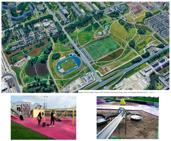 Outdoor recreational spaces such as playgrounds, sports facilities, and fitness camps are designed to enable and foster physical activity in children [,]. Playgrounds should provide a range of different equipment and offer spaces (e.g., paved areas) for a variety of play activities to meet the needs of as many children of both sexes as possible []. A study in Australia revealed that as children transition from preschool (3–5 years) to primary school age (6–11 years), they visit parks that have more facilities to support physical activities and active recreation []. Several studies have also shown that the perceived existence of playground equipment and services in parks are essential factors for encouraging both children and parents to be active [,,]. A good example of an outdoor recreational space with playgrounds and sports facilities is Nelson Mandela Park in Amsterdam [], shown in Figure 5.