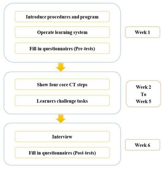 CT has been a popular research topic in recent years [9]. In 2006, Professor Wing of CMU indicated that CT is a basic skill needed in daily life and that CT is a key element for elementary education. She re-defined CT and showed that it is just as important as the “3 Rs” (reading, writing, and arithmetic) and that every child should be encouraged to hone their analytical skills using CT [10]. CT is a thinking process in which people use basic concepts and logical methods from computer science to identify and seek solutions step by step [10,11]. Accordingly, learning CT helps us tackle problems more effectively, understand root causes, and address more sophisticated problems [12,13]. In addition, the increasing importance of CT has motivated countries throughout the world to implement CT training policies [14,15].