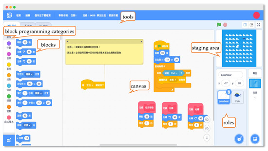 We customized the interfaces and functions of the VP platform in this study in line with the research design and created cross-platform learning environments for VP using website features, as shown in Figure 2. The Scratch interface was divided into six major parts: (1) block programming categories; (2) blocks; (3) canvas; (4) staging area; (5) roles; and (6) tools. From those parts, students reflected on and selected the desired block programming category and then dragged the programs to the canvas to combine the blocks. After constructing the program, they clicked the green flag to run it or the red button to suspend it in the staging area to preview the logical results of the program.