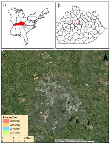 Reforest The Bluegrass planting sites in Lexington, KY, USA. (a) The location of Kentucky within the eastern USA; (b) the location of Fayette County within the eastern half of KY; (c) the distribution of Reforest The Bluegrass sites across the city of Lexington. Sites were planted annually between 2000 and 2019. Figure from Sena et al. (2021).