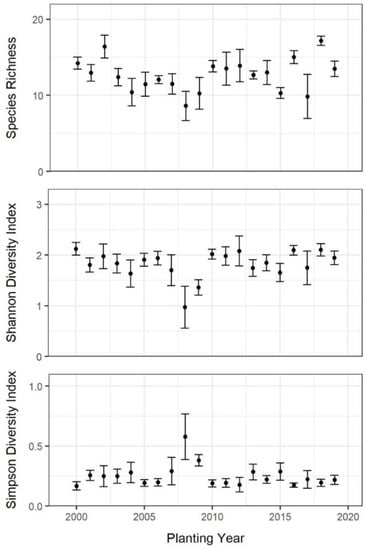 We calculated a series of alpha and beta diversity metrics to investigate patterns in the development of the understory plant community across the chronosequence of RTB planting sites. To compare diversity metrics among sites, we first performed rarefaction to account for differences in sampling intensity across sites. Rarefaction entailed drawing 10,000 bootstrapped resamples of the intensity of the least-sampled site from target datasets and calculating the metric of interest; the mean of the bootstrapped distribution was used as the rarefied estimate [,,]. To evaluate temporal trends in alpha diversity, we first calculated rarefied estimates of species richness, the Shannon diversity index, and the Simpson diversity index for each plot; then, we evaluated the relationship of each metric with planting year using non-parametric Spearman rank correlations (ρ) via functions in the stats package of the R programming language [].