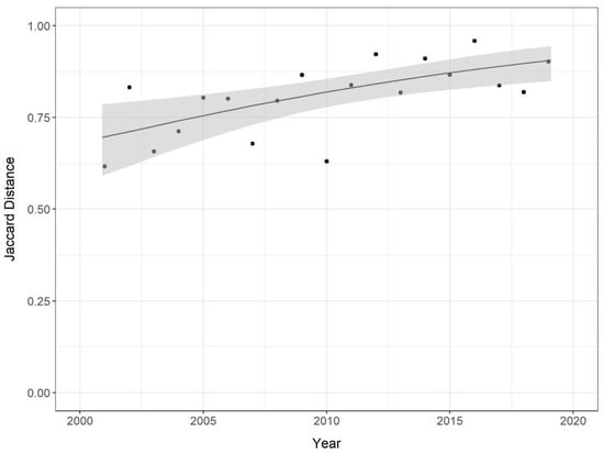 Conversely, a positive effect of planting year was apparent in the pairwise Jaccard Distance between the community assemblages in 2000 and those in successively younger planting sites (βYear = 0.25, p = 0.003; Figure 3). This indicates that understory community composition is increasingly dissimilar, with an annual change in plantation age. The effect of planting year accounted for nearly half of the variability in the pairwise Jaccard Distance of understory assemblages (R2 = 0.42). The mean Jaccard Distance between the assemblages of sites planted in 2000 and 2019 approached 0.9, identifying a near-complete disjunction of species compositions between the sites; the maximum observed pairwise Jaccard Distance was 0.96 with the 2016 planting site. Notably, the assemblages between the sites planted in 2000 and 2001 possessed a Jaccard Distance of 0.62, indicating only a 38% overlap in understory species between the two oldest planting sites.