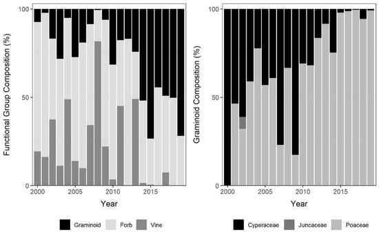 The relative composition of plant functional groups in RTB sites varied significantly with time. Graminoids were positively correlated with planting year (ρ = 0.73, p < 0.001), possessing the greatest percentage of groundcover in recent planting sites (Figure 4). Among the graminoids, the relative composition of Poaceae increased with planting year, while Cyperaceae was more abundant in older plantings; Juncaceae occurred in only three plots across two sites (2002 and 2018) and represented less than 5% of groundcover in these plots (Figure 4). In contrast to graminoids, forbs (ρ = −0.46, p = 0.04) and vines were negatively correlated with year (ρ = −0.6, p = 0.006; Figure 4), indicating an increased prevalence of both groups in older plantings. Species characterizing woody vines included Campsis radicans (L.) Seem. ex Bureau (trumpet vine), Euonymus fortunei, Lonicera japonica Thunb. (Japanese honeysuckle), Parthenocissus quinquefolia (L.) Planch.(Virginia creeper), Toxicodendron radicans (L.) Kuntze (poison ivy), and Vitis spp., although Euonymus fortunei comprised 87% of the group’s coverage across all sites.