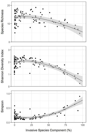 Nonlinear effect (regression mean ± 95% CI) of invasive species prevalence on species richness, Shannon diversity index, and Simpson diversity index of understory plant communities within Reforest The Bluegrass planting sites in Lexington, KY, USA.