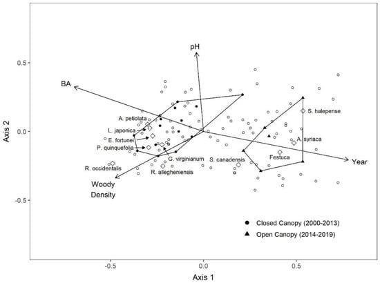 Ordination via nonmetric multidimensional scaling (NMDS) of mean importance values of understory taxa in Reforest The Bluegrass planting sites in Lexington, KY, USA. Open circles (○) identify observed taxa. Important taxa are illustrated with an open diamond (◇) and labeled. Convex hull polygons distinguish clusters of sites with open and closed forest canopy. Continuous covariates with significant associations to NMDS axes are depicted as vectors. A. petiolata = Alliaria petiolata; A. syriaca = Asclepias syriaca; E. fortunei = Euonymus fortunei; Festuca = Festuca spp.; G. virginianum = Geum virginianum; L. japonica = Lonicera japonica; R. allegheniensis = Rubus allegheniensis; R. occidentalis = Rubus occidentalis; S. canadensis = Solidago canadensis; S. halepense = Sorghum halepense; P. quinquefolia = Parthenocissus quinquefolia.