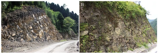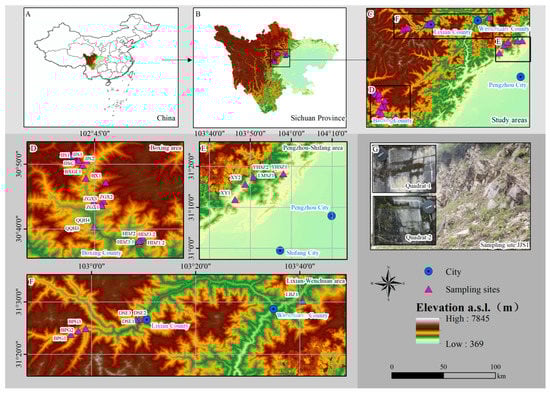 This study was carried out in western Sichuan, the hinterland of Southwest China (26°03′–34°19′ N, 97°21′–108°12′ E) (Figure 1). Since different geographic locations may have different environmental conditions, a general research area related to climatic differences was defined according to geographic location within the study area: (1) In the Baoxing sampling area, the altitude ranges from 1942 to 4166 m above sea level (a.s.l.). The subtropical–cold temperate humid monsoon climate prevails in this area, with a mean annual temperature (MAT) of less than 10 °C and a mean annual precipitation (MAP) of less than 1000 mm []. (2) In the Pengzhou–Shifang sampling area, the altitude lies within ~900 and 1200 m a.s.l. The subtropical humid monsoon climate controls this area, with MAT of 12–14 °C and MAP of 1000 mm or higher. (3) In the Wenchuan–Lixian sampling area, the altitude is between ~2000 and 2500 m a.s.l. This area is dominated by a warm temperate continental semiarid monsoon climate, with a MAT of 6–10 °C and MAP of 540–610 mm []. Due to a wide range of altitude differences and complex terrains, the climate obviously varies with increasing elevation in all sample areas. The altitude, rainfall, and other environmental factors in each sampling area are shown in Table 1. In the study area, a large area of cut rock slopes have been produced by the intensive and extensive construction of transportation and mining projects, characterized by high and steep slopes with instability.