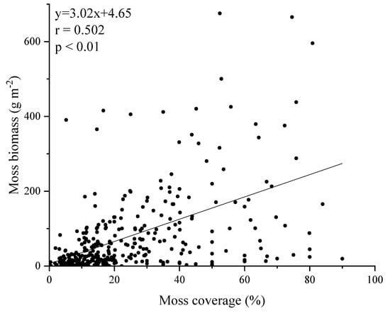 Plots between moss coverage and moss biomass in the natural restoration process on cut rock slopes in west Sichuan’s mountainous region.