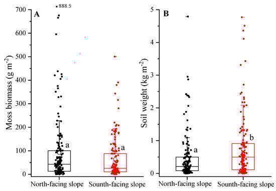 Moss biomass (A) and soil weight (B) in moss–soil crusts on north-facing and south-facing cut rock slopes in west Sichuan mountainous region. Different letters represent significant difference at p < 0.05 between two slope aspects.
