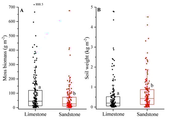 Moss biomass (A) and soil weight (B) in moss–soil crusts of cut rock slopes developed on limestone and sandstone in west Sichuan mountainous region. Different letters represent significant difference at p < 0.05 between limestone and sandstone.