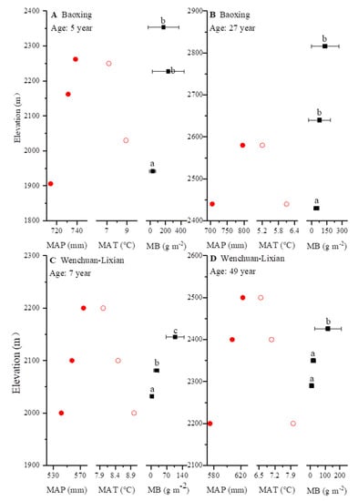 Variation of moss biomass with altitude in Baoxing and Wenchuan–Lixian areas. MAP: mean annual precipitation; MAT: mean annual temperature; MB: moss biomass. Different letters represent significant difference at a level of p < 0.05.