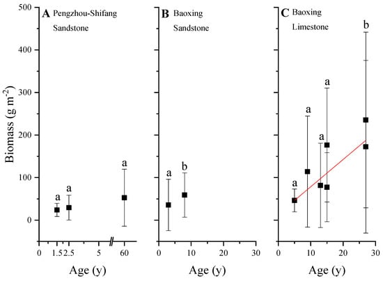 Variation of moss biomass with restoration age on cut rock slopes. (A) The altitude within 1003 and 1177 m, sandstone, Pengzhou–Shifang; (B) the altitude within 3716 and 3880 m, sandstone, Baoxing; (C) the altitude within 2024 and 2430 m, limestone, Baoxing. Different letters represent significant difference at p < 0.05.