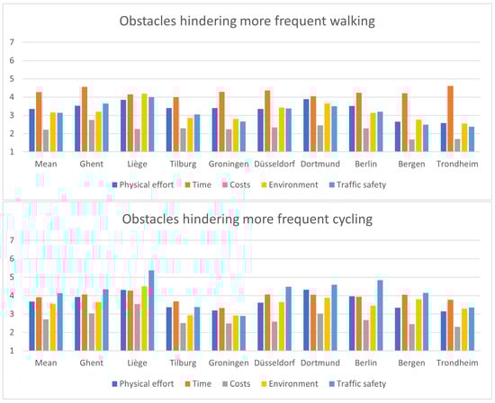 The top figure in Figure 1 illustrates the level at which respondents view various potential obstacles as hindrances to cycling more frequently. The bottom figure illustrates the same for walking. In general, traffic safety (or lack thereof) is rated as the most significant barrier to cycling, followed by time, physical effort, and the physical environment (such as climate and hilly terrain). The least significant obstacle was cost. Differences in perceptions of obstacles can also be observed between cities. Respondents from Dutch cities tend to rate obstacles as less important, while those from Liège tend to rate them as more important.