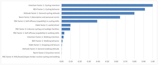 Figure 2 displays the importance of the different factors in terms of the prediction of cluster membership (i.e., in separating the clusters). One can observe that especially cycling-related factors, such as cycling intention, cycling behaviour and general cycling attitude, explain the differences between the two clusters.