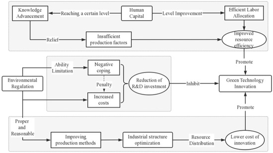 There is a rich body of research on environmental regulation and green technology innovation, and most of the literature demonstrates the relationship between the two, arguing that environmental regulation affects green technology innovation directly or indirectly through channels such as costs, industrial structure, investment decisions, and internal corporate management. On this basis, we choose two perspectives, human capital and industrial structure optimization, to analyze more specifically the impact and role of environmental regulation on green technology innovation. On the one hand, human capital is the key to the competitiveness of market players and the driving force of technological innovation, but at the same time it is also strongly influenced by policy regimes. We argue that the level of human capital means there are different responses to environmental regulations at different stages and thus it has different degrees of impact on green technology innovation. On the other hand, in the economic system, the industrial structure plays a crucial role in the development of enterprises, industries, and the country, so policy actions such as environmental regulations can have a serious impact on the industrial structure, and the state of the industrial structure will respond to the specific behavior of market players, ultimately affecting the development process of green technology innovation in China.