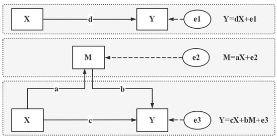 The mediating effects model is often used to measure the role of mediating variables in the relationship between the influence of the core explanatory variables on the dependent variable, as shown in Figure 2. In the 1980s, Baron and Kenny [39] first proposed the sequential test coefficient method, a test on mediating effects, whose main method is to test whether the core coefficients are significant. Based on this, Wen Zhonglin et al. [40] improved M. E. Sobel’s test, making it more scientifically rigorous and more generalizable to large sample data, and the academic community fully affirms this method and uses it to date.