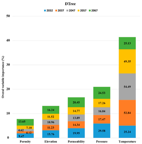 Figure 4 and Figure 5 illustrate the variable importance plots for the DTree and RF models approximated by SHAP. Multiple starting points were considered when estimating the SHAP values to ensure the reliability and reproductivity of the data. The results from the RF and DTree models were similar, with temperature and permeability being the most and least essential variables in controlling the plume outline, respectively. Pressure, porosity, and elevation had a similar variable importance value of around 10% to 20%. Figure 4 and Figure 5 also show the percentage of the variable importance for the variables at each time step (see the number in the boxes). A parameter with a higher percentage should have had more control over the match between the simulated and observed plume outlines. For example, in 2032, the model prediction was mainly affected by the uncertainty in pressure.