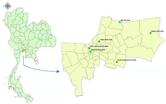 Figure 2. Map showing locations of the six selected parks for this study in Bangkok, Thailand.