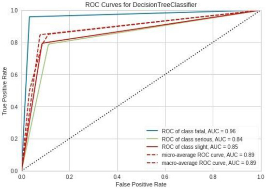 With the help of the ROC curve shown in Figure 2, it further examines how well the Decision Tree with default settings will predict the three classes of accident severity considering different thresholds. Additionally, the AUC gives a single value metric that makes it easy to comprehend how well the classification model performs in predicting each class. For the perfect unrealistic curve (a point at the upper left corner of the chart), the area under the curve will be 100%, while for the completely random class (the diagonal line on the chart) the area under the curve will be 50%. A class that performs worse than a random class will have an area below 50%. Here, class-1(fatal) is more accurate in this case than class-2(serious) and class-3(slight), as class-1 has a larger area under the curve than classes 2 and 3.