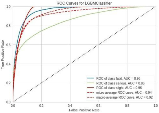 Figure 4 shows the resulting ROC chart of the LightGBM model with default settings of every type of injury. The AUC of fatal injury was 0.96, for serious injury it was 0.86 and for slight injury it was 0.96, all of which show that the model has a decent ability to predict outcomes/different classes. Figure 5 shows that the LightGBM model with hyper-tuning settings performed marginally better in predicting the AUC of the three classes. Both macro-average and micro-average ROC curves were also produced. The micro- and macro-average ROC curves values obtained with hyper-tuning parameters are slightly different to those obtained with default parameters, i.e., AUC (LightGBM tuning) micro, macro = 0.96, 0.95 while AUC (LightGBM default) micro, macro = 0.94, 0.92 as shown in Figure 4 and Figure 5.